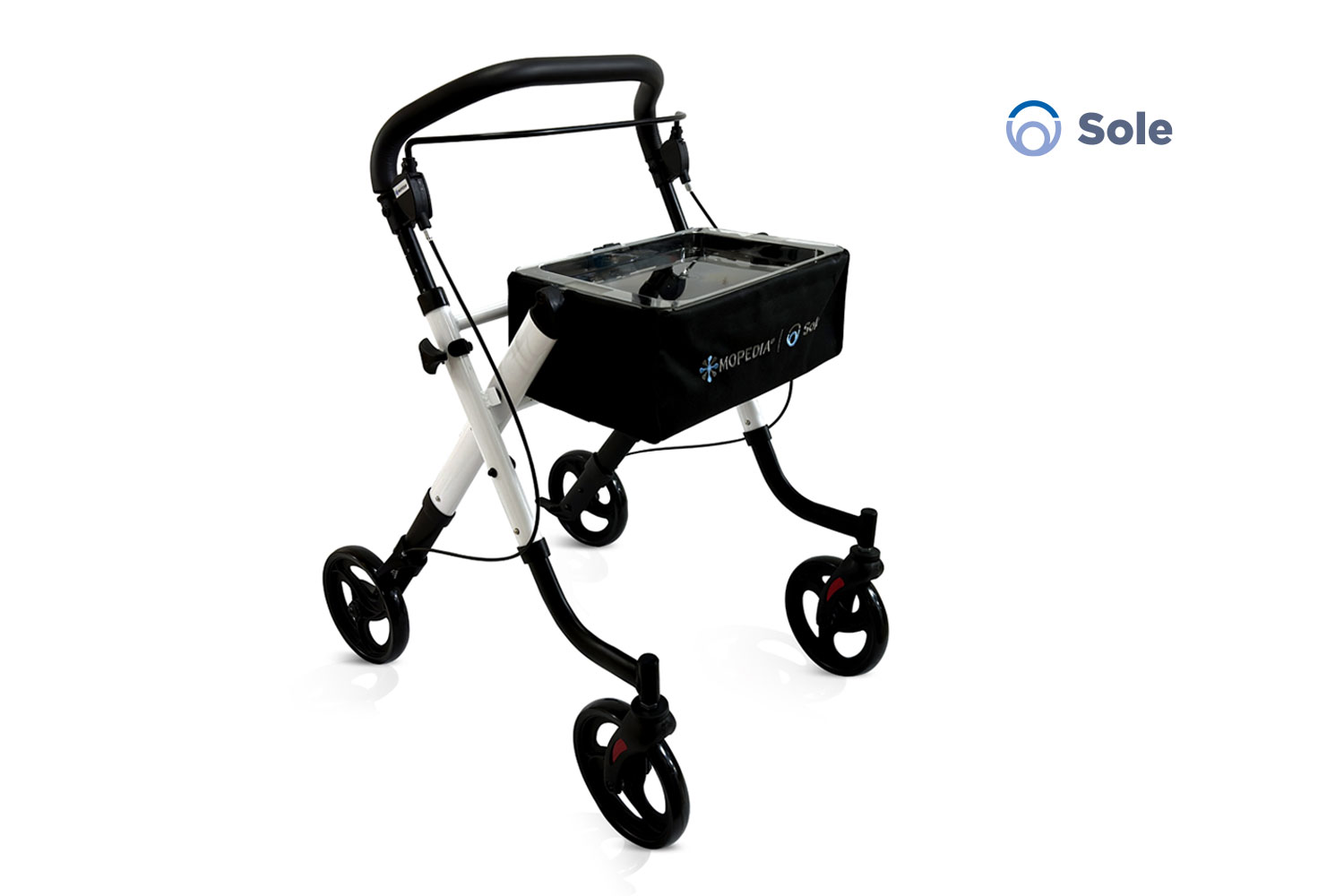 SOLE RP505 Indoor Folding Aluminum Rollator SOLE RP505, with transparent tray and storage bag, single-lever brake handlebar, and lightweight, foldable structure. Ideal for support and mobility at home.