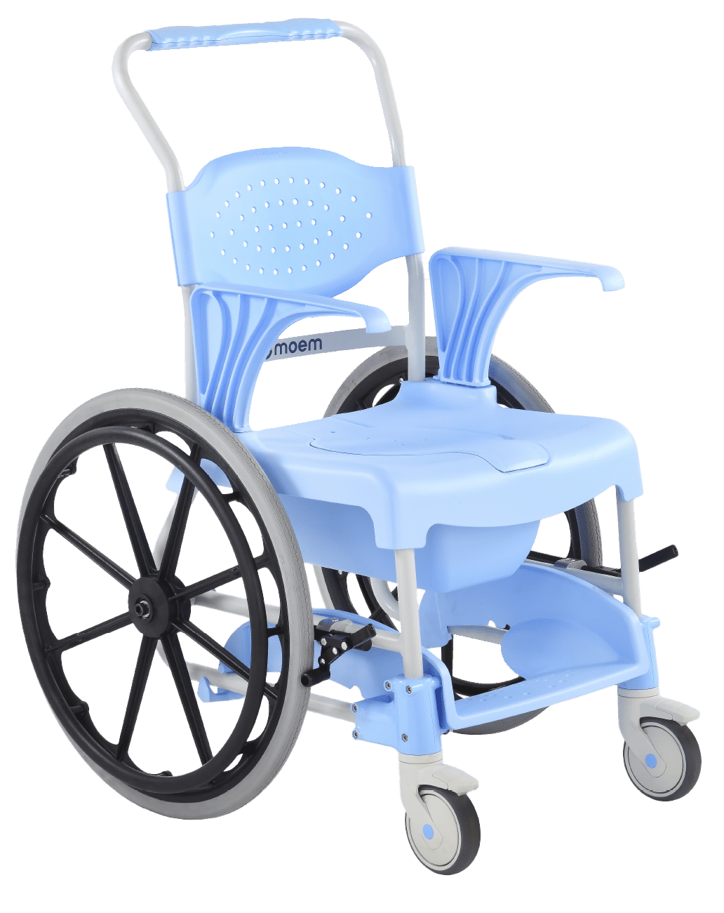 MOEM shower and toilet chair with large rear wheels, front brakes and included bucket. Facilitates hygiene and movement for people with reduced mobility.