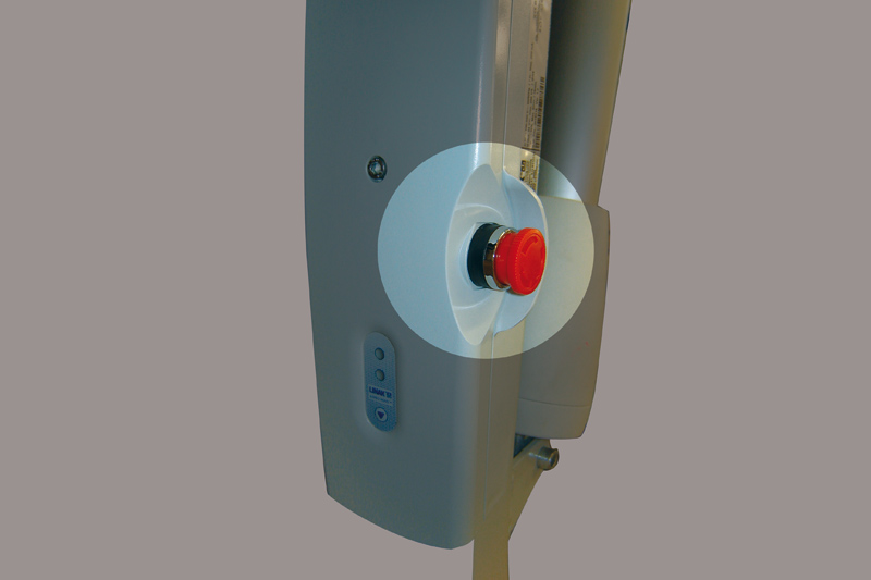 Sistema de bajada de emergencia eléctrico y apertura de patas manual con pedal para acceso cómodo a sillas o camas.