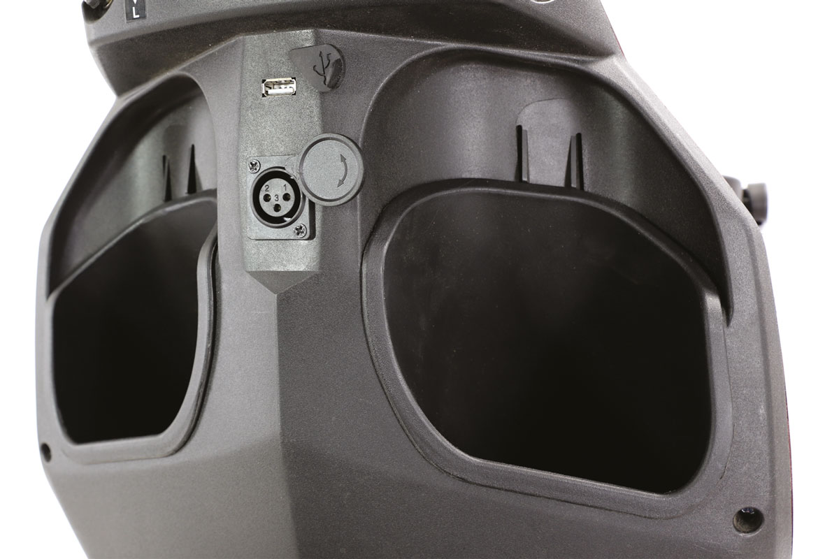 Tablero de control con pantalla LCD, espejos retrovisores, selector de modo de conducción, toma de corriente y puerto USB.