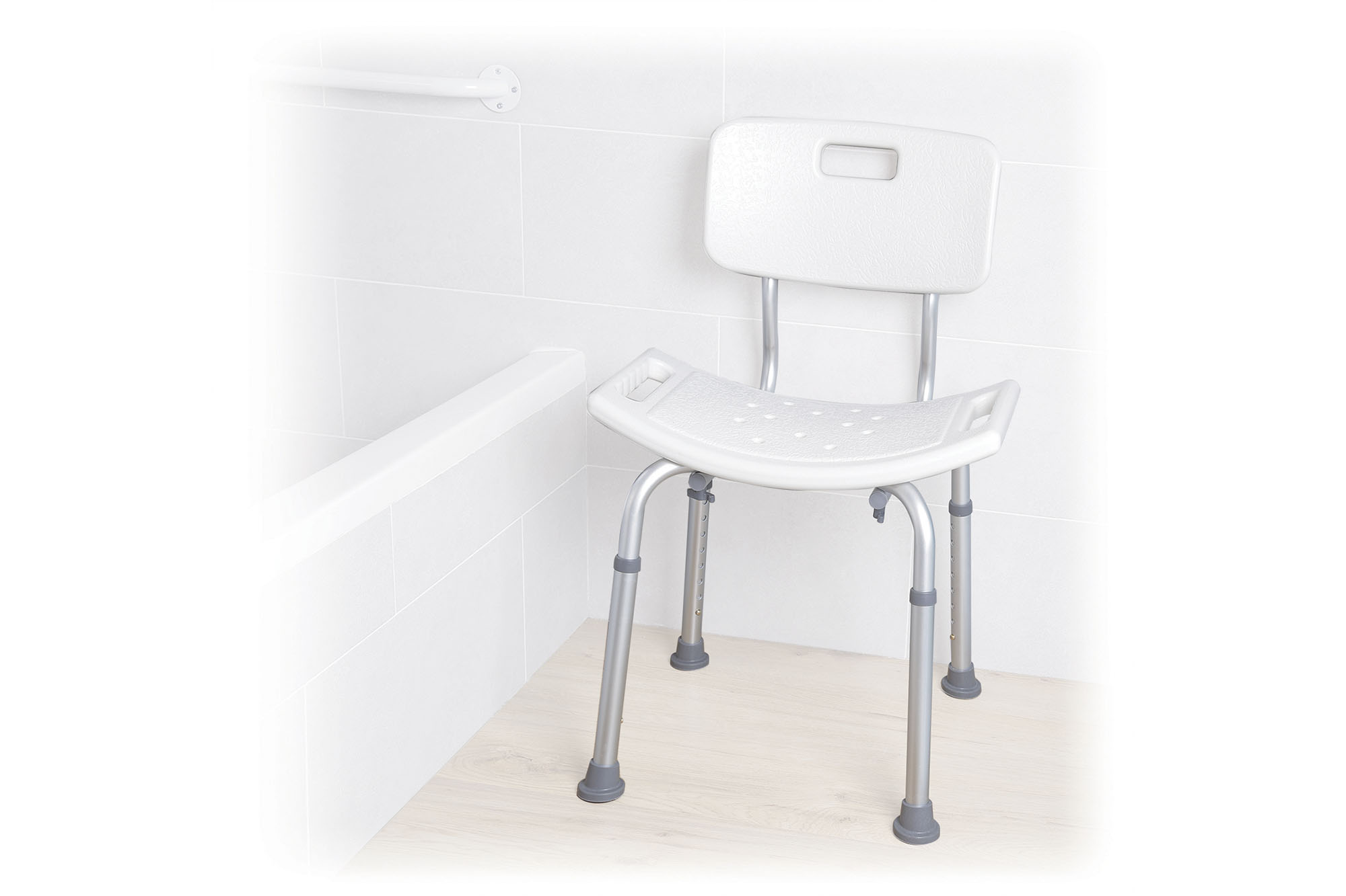 Silla de ducha con respaldo ergonómico para mayor confort.