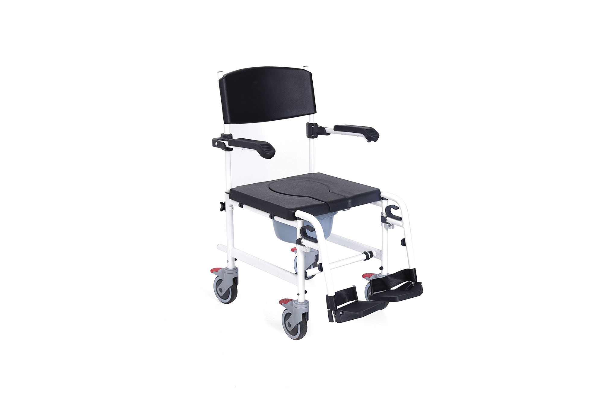 La silla es regulable en altura y está equipada con apoyabrazos abatibles, que facilitan las transferencias de la persona desde y hacia la silla. Dispone de cuatro ruedas giratorias con freno, lo que proporciona gran maniobrabilidad y seguridad en espacios estrechos como baños. Los reposapiés son abatibles y extraíbles para adaptarse a las necesidades del usuario y permitir una posición cómoda durante el aseo.